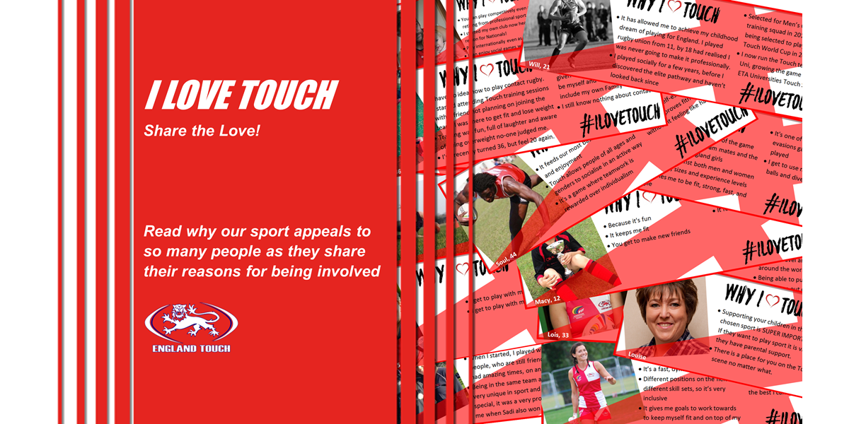 England Touch wanted to share their love of the game and find out why their sport appeals to so many people of different ages, genders and all walks of life.The '#ILoveTouch' campaign highlights some of the reasons why we play and is the voice of our Touch family.Read some of their thoughts here and share the passion for our game. ...