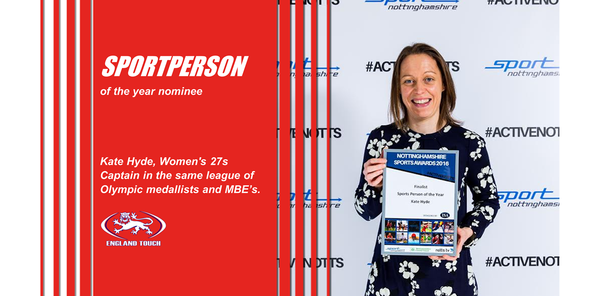 Kate Hyde, Women's 27s Captain has every right to feel proud.Kate lives in Nottingham and has represented both the Senior Mixed and the W27 over her 5 year international career. She captains the Nottingham Hoods Touch team. She also plays hockey with Boots hockey club, a well established team in the city.Kate was nominated for the Notts Sports personality of the year after a s ...