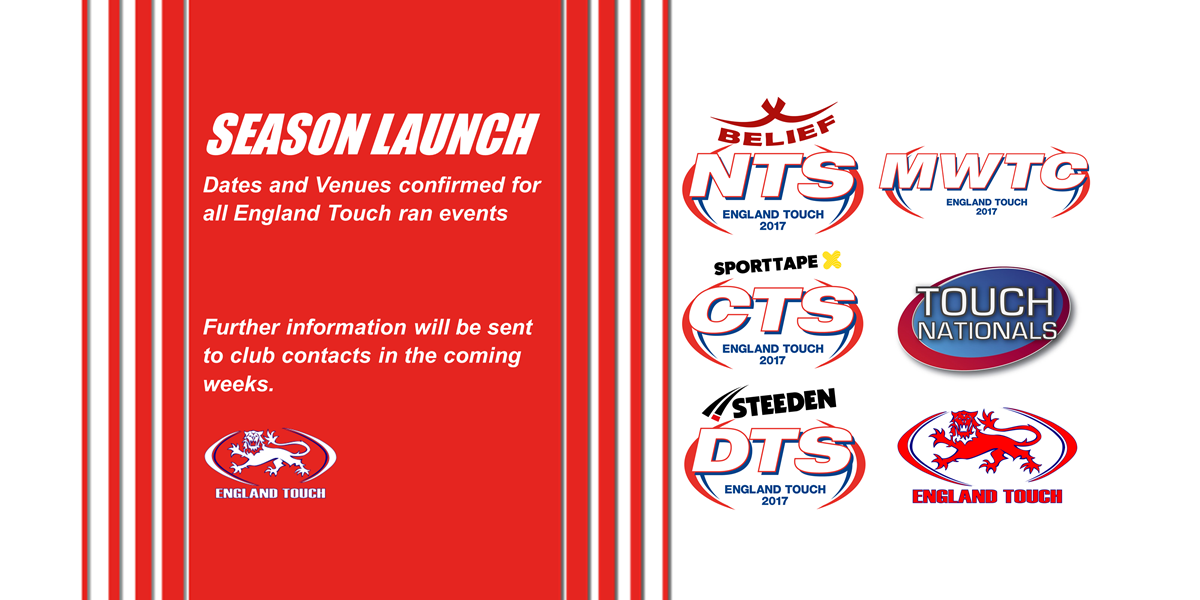 All England Touch ran events have now had their dates and venues confirmed. Further information will be sent to club contacts soon.Note: A new registration process will be implemented in the coming months. NTS/CTSDateVenue6th May 2017Nottingham20th May 2017Cambridge10th June 2017Coventry29th July 2017London16th Sept 2017NottinghamNational DTSDateVenueDivisionEnter he ...