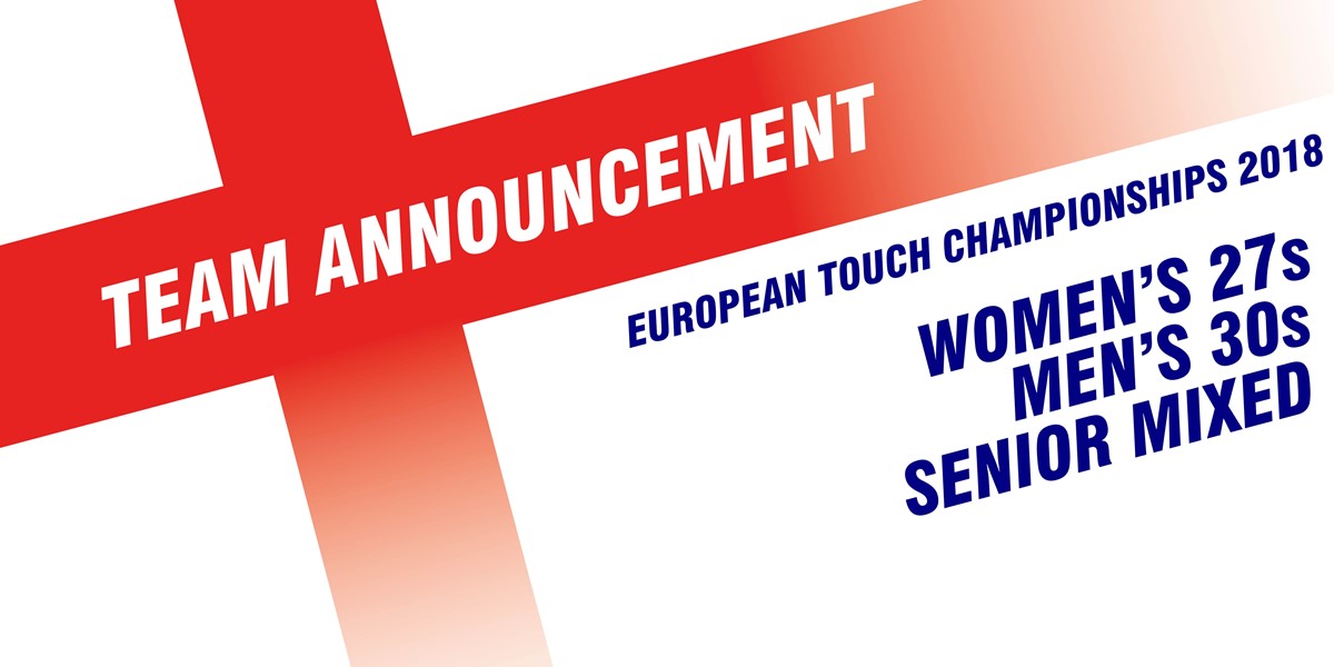 The players have been announced who will represent England in the Women's 27s, Men's 30s and Senior Mixed competitions at this summer’s European Touch Championships! Congratulations to everyone who has been selected! Women's 27s Nicolette Bird London Galaxy Louise Carr Thames Valley Vikings Stacey Collins London Galaxy Victoria Franks Cambridge Katherine Jones Cambri ...