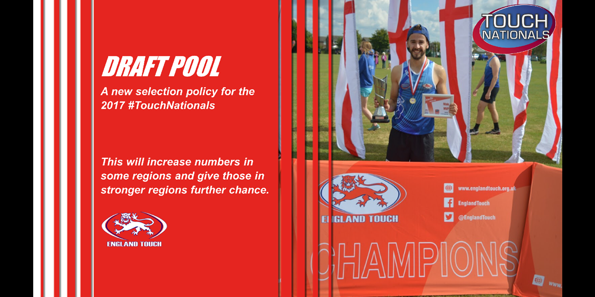 For the 2017 England Touch Nationals, players who are unable to be selected for their home regional side for any reason (selection, non attendance at trials etc) will be able to nominate into a central draft pool. The nomination form will be embedded on the ETA website.This draft pool will open from 1st June until 10th August 2017 and will be publicly available on the website. ...