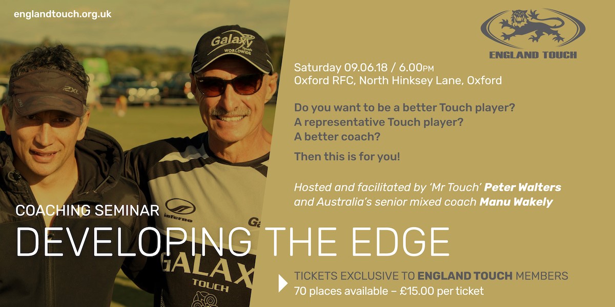 Peter Walters and Manu Wakely will be delivering 'Developing the Edge' at Oxford RFC on the evening of Saturday, June 9th, straight after the end of day one of the Men's and Women's National Touch Series round which is being held at the same venue.